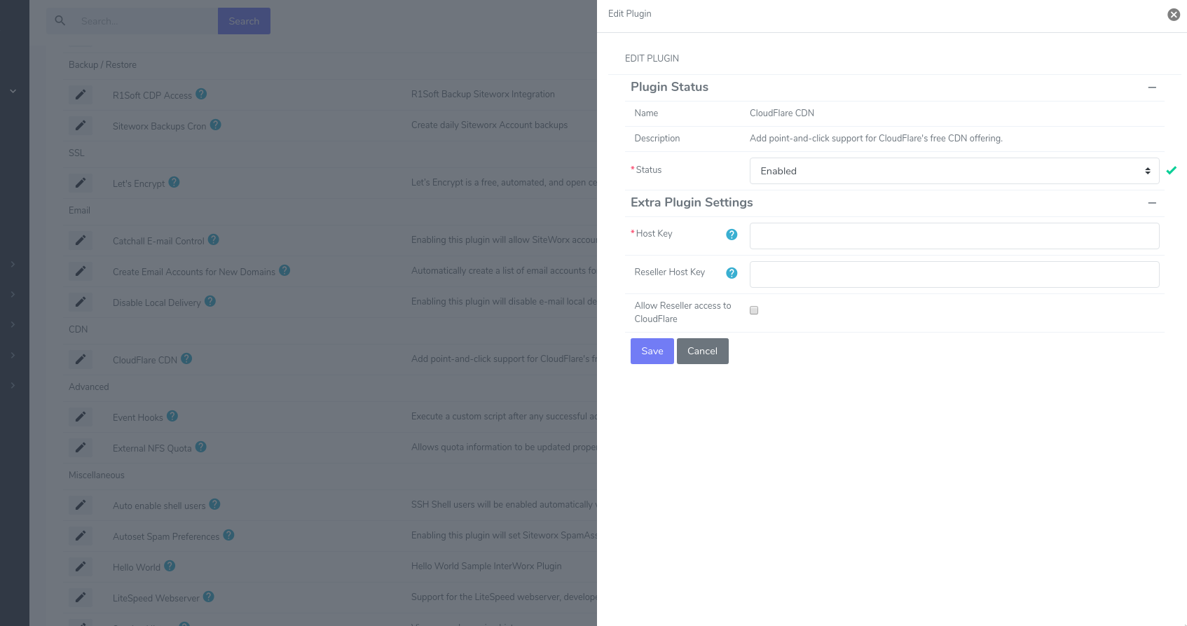 The cloudflare partners program allows you to resell cloudflare services. The plugin allows a siteworx customer to either create a cloudflare account under your partners account and add their domains to it or link their siteworx account to an existing cloudflare account.
